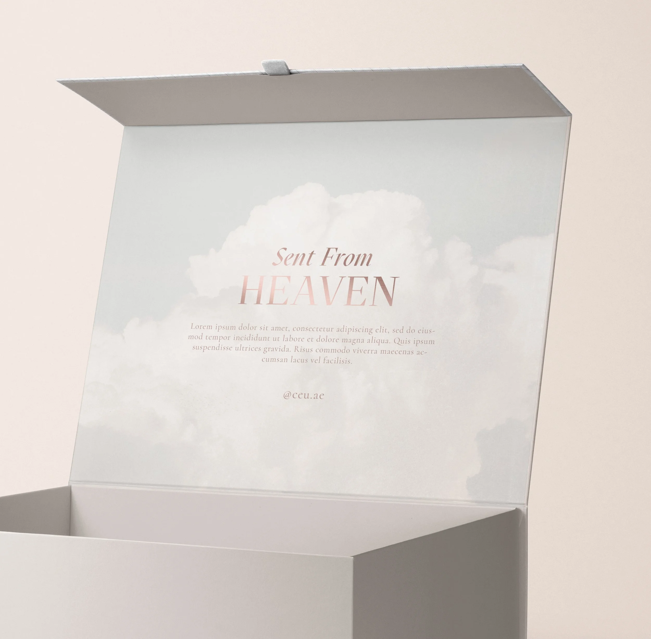 A luxury loungewear brand based in Abu Dhabi, based on the concept of heaven and skies, the softness of clouds. The purpose of the brand is to provide the luxury of comfort while looking your best. Complete Brand identity design was creeighted, beginning with the naming, packaging designed with minimalism and sophistication to embody the feminine concept of the brand. Published with social media aesthetics and templates.